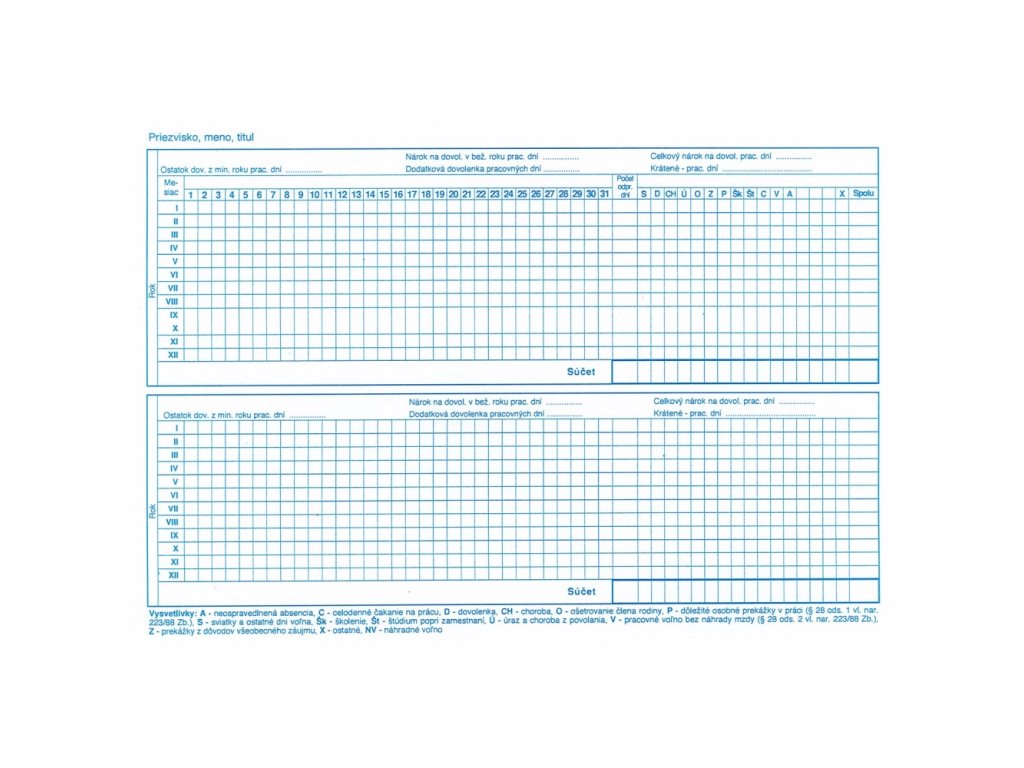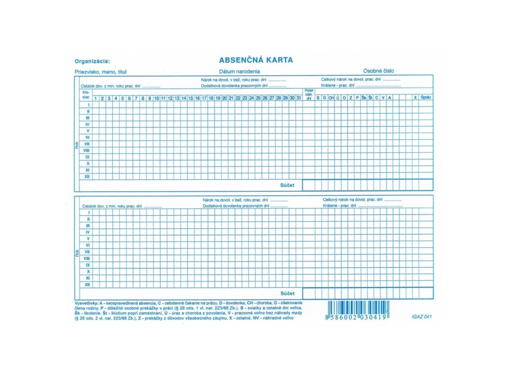 Absenčná karta obojstranná na evidenciu dochádzky.Dodatočné parametre