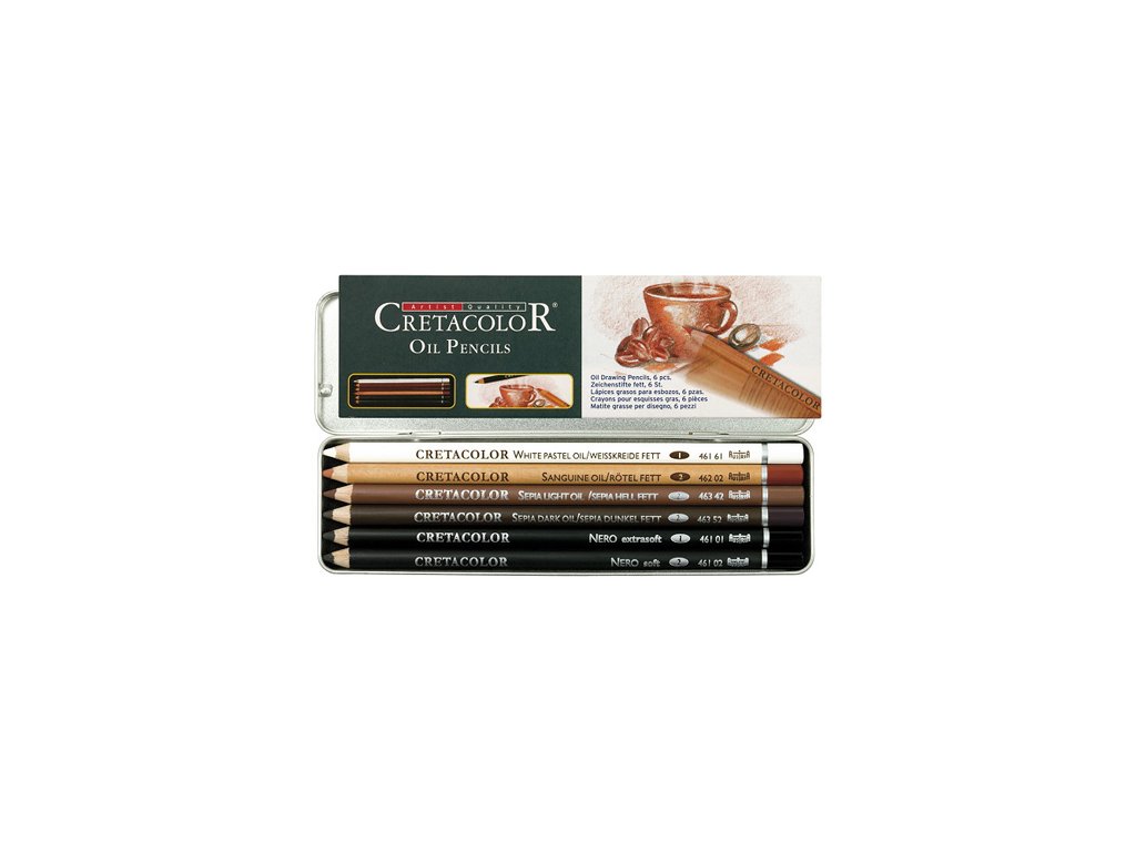 Sada 6 olejových ceruziek, vynikajúcich pre všeobecné použitie, na skicovanie a kreslenie. K dosiahnutí hustých, lesklých, nerozmazávajúcich ťahov. Ceruzky sú na báze oleja, a preto odolné proti vode. Plechová krabička v papierovom obale ideálne ochráni ceruzky proti prípadnému polámaniu. Výber zahŕňa odtiene: White Chalk, Sanguine, Sepia light, Sepia dark, Nero soft a extra soft.Dodatočné parametre