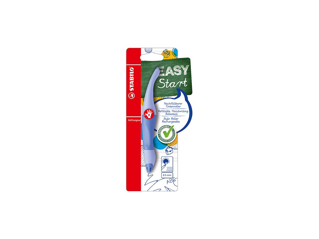 STABILO EASYoriginal Pastel prináša trend pastelových farieb do školských tried. Ergonomický roller pre začiatočníkov a študentov od 6 rokov. Jedná sa o prvý roller v ergonomickom tvare, vo variante zvlášť pre ľavákov a pravákov, ktorý bol navrhnutý špeciálne pre deti, ktoré sa učia písať. Ergonomická nekĺzavá úchopová zóna podporuje uvoľnené držanie a zabraňuje únave svalstva ruky a bolesti pri písaní. Vďaka guľôčke v náplni roller ľahko kĺže po papieri. neškriabe, nerobí machule a s každou novou náplňou dostane pero nový hrot. Modrý zmizíkovateľný atrament.Dodatočné parametre