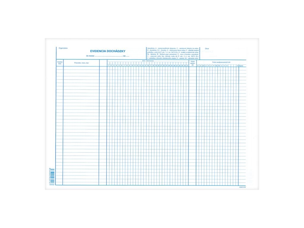 Tlačivo - evidencia dochádzky, A3Dodatočné parametre
