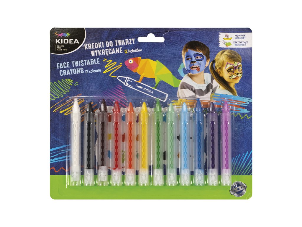 Ceruzky na tvár v dvanástich výrazných farbách, ktoré sú vďaka svojej jemnosti ako stvorené na precízne kreslenie kreatívnych kresieb na pokožku.