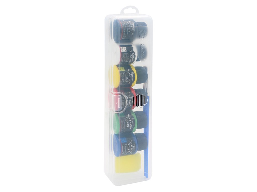 Farby na sklo v priehľadnom, plastovom obale + 3 ks štetcov a hubka.