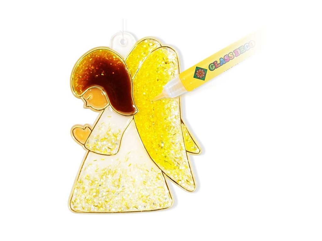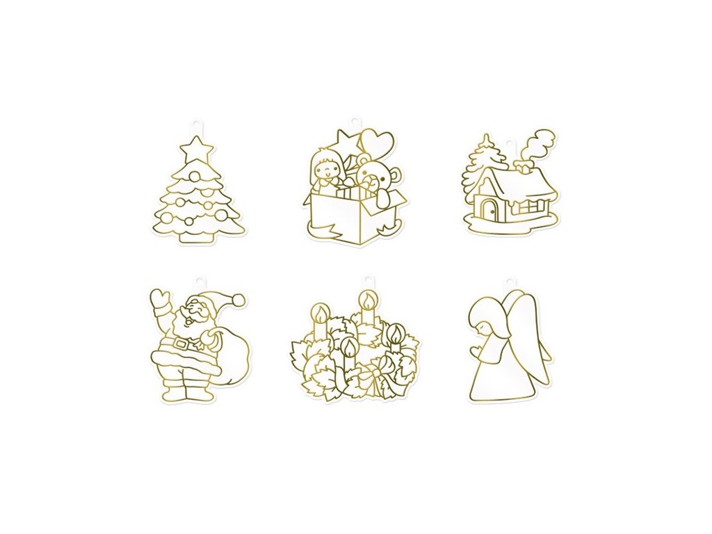 - 6 ks závesných sklíčok na vyfarbenie (cca 8-10 cm), motívy: stromček, krabice s darčekmi, adventný veniec, anjel, domček, Santa