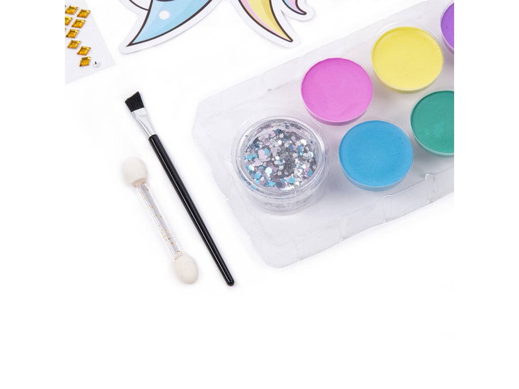 farby na tvár v 6 odtieňoch - ružová, žltá, fialová, modrá, tmavomodrá a biela, flitre a trblietky.