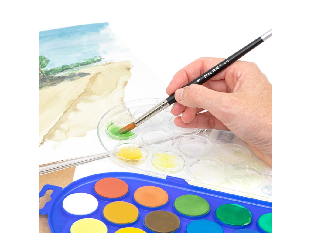 Vodové farby MILAN sú určené na maľovanie na papier a iné savé materiály, riediteľné vodou. Netoxické, 22 farieb s priemerom 30 mm, dodávané so štetcom v plastovom ochrannom puzdre, súčasťou je aj štetec.Dodatočné parametre