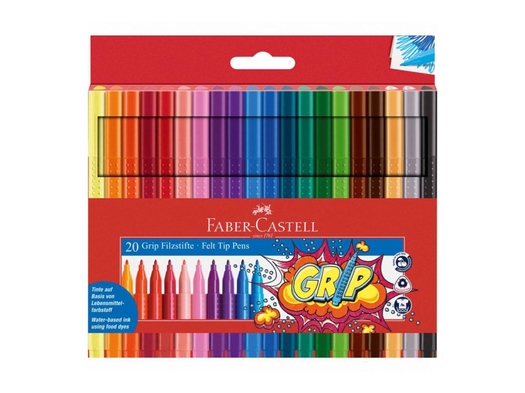 Popisovače Grip. Ergonomický trojuholníkový tvar pre ľahké držanie. Soft-grip úchop zamedzuje kĺzaniu popisovača pri práci. Atrament na báze vody. Pre všetky vekové kategórie. · Atrament je vyprateľný z väčšiny tkanín · Atrament s potravinárskym farbivom · 20 farebnéDodatočné parametre