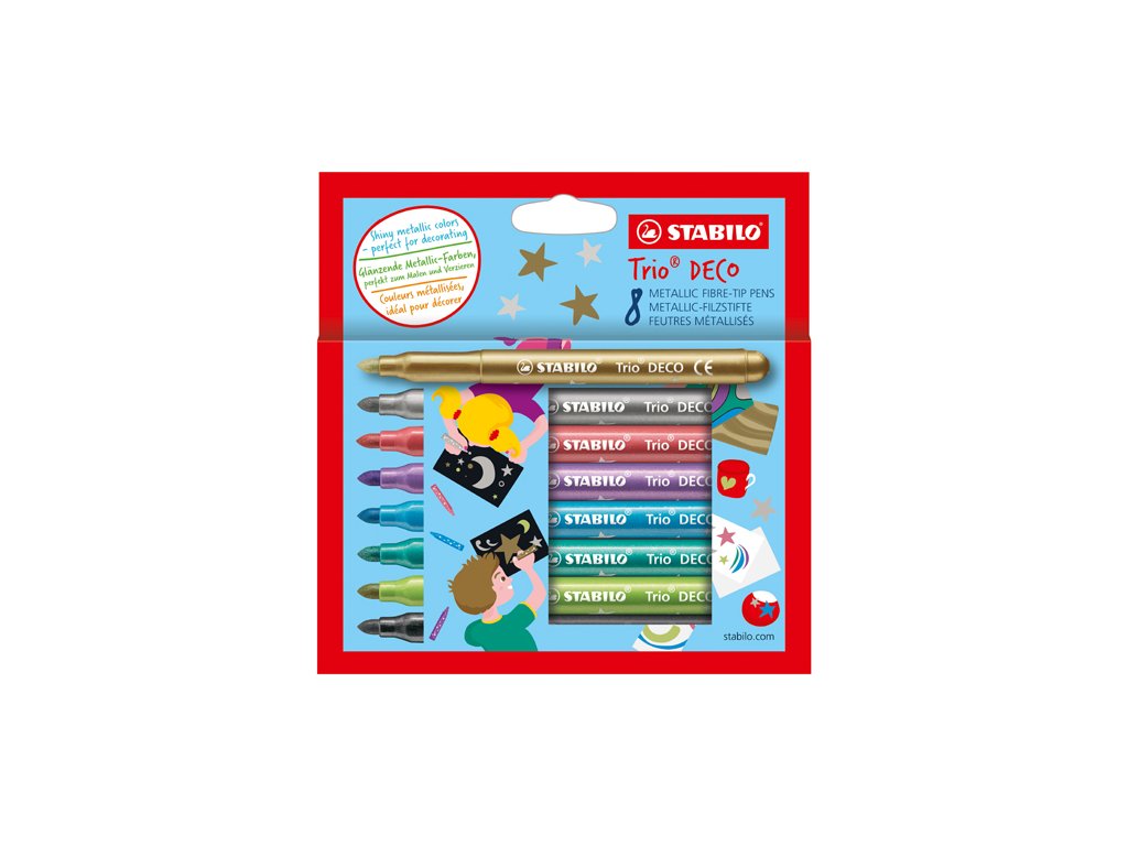 Metalické vláknové fixy STABILO Trio DECO poskytujú deťom a ich umeleckým dielam žiarivú iskru. Dospelí sú nadšení, keď vidia, že ich deti môžu kresliť rôznymi spôsobmi a používať rôzne kresliace pomôcky. 8 trblietavých farieb magicky pritiahne každú detskú ruku. Či už v škole alebo doma s kamarátmi – obrázky získaju špeciálny žiarivý lesk a šmrnc. Vďaka ergonomickému tvaru fixy perfektne padnú do malých detských rúk. Trojhranná úchopová zóna intuitívne navádza k správnemu držaniu už od úplných začiatkov. Extra silný hrot XL so šírkou stopy 3 mm má vysoký výdaj farieb a okamžite vyfarbí veľké plochy papiera, kartónu alebo dreva. Metalická vláknová fixa dodá trblietavý efekt všetkým kreatívnym nápadom, napríklad vianočným želaniam. Vďaka tomu sú veľmi populárne u kreatívcov a fanúšikov "do-it-yourself". A tiež sú skvelým darčekom pre všetkých umeleckých nadšencov!