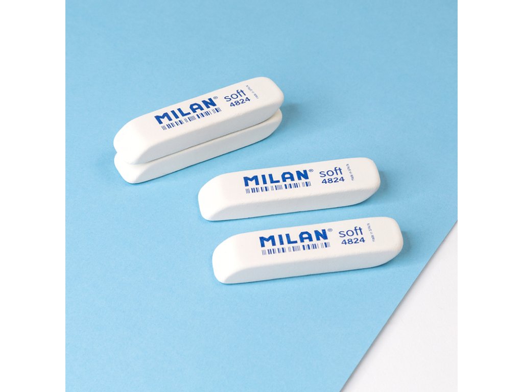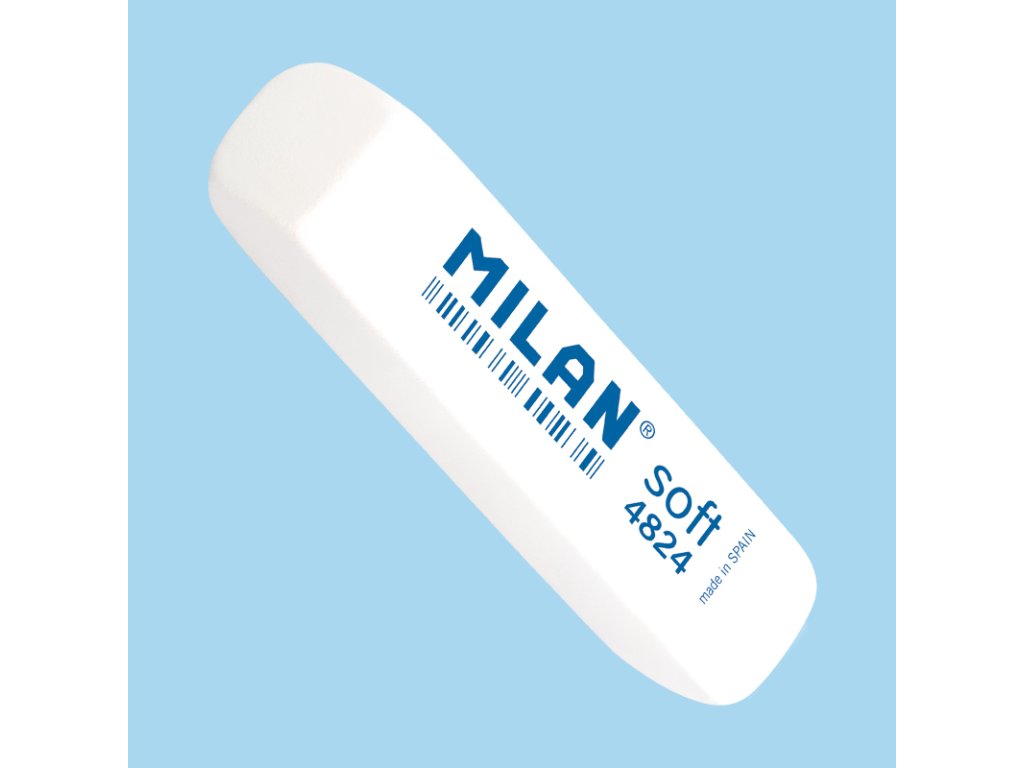 Pružná skosená guma MILAN 4824 soft je zo syntetickej gumy. Môže byť použitá na mazanie grafitových ťahov ceruzkou zo všetkých druhov papiera. Fraba gumy je biela.Dodatočné parametre