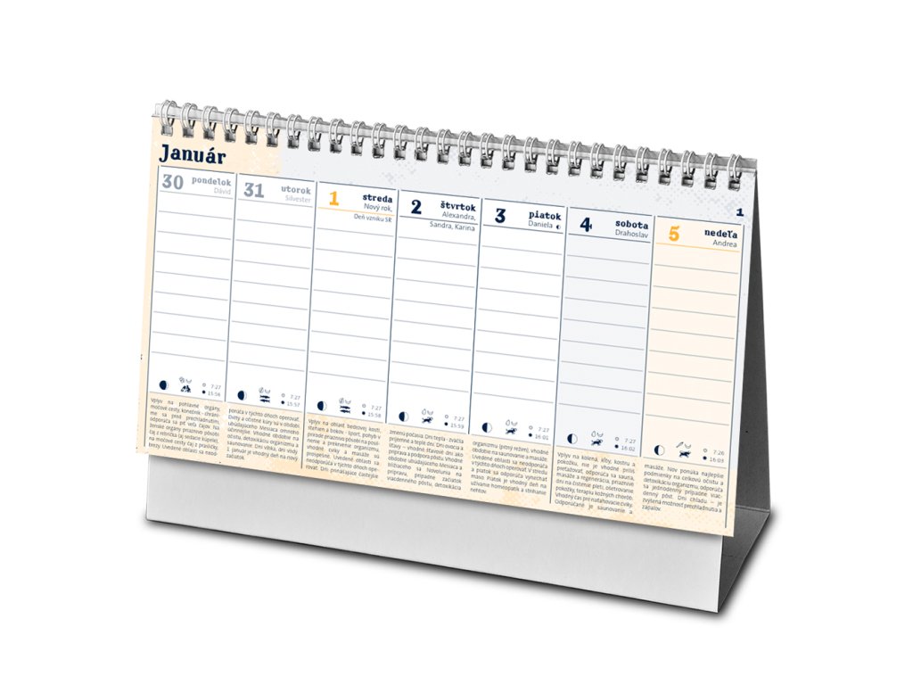 Stolový týždenný kalendár, s listami z 80g bezdrevého papiera, viazaný kovovou bielou špirálou. Rozmer: 234x133 mm.Dodatočné parametre