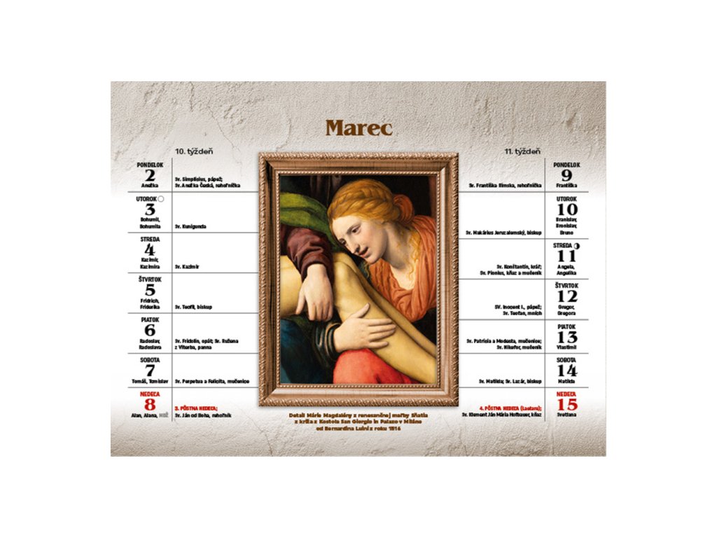 Formát: 220 × 165 mm. Vario špirála, natieraný lesklý papier, 32 strán. Cena za 1 ks výrobku. Stolový dvojtýždňový kalendár s náboženskou tematikou zachytenou na krásnych maľbách, mozaikách, reliéfoch a freskách, od slávnych i neznámych autorov, s popisom zobrazenia. Obsahuje bohaté cirkevné a svetské kalendárium. Možnosť potlače na presah podložky (220 x 35 mm).Dodatočné parametre