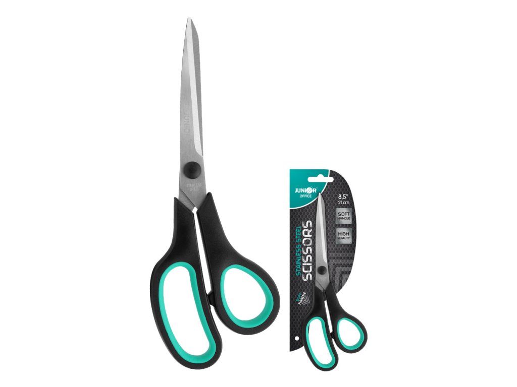 Nožnice s asymetrickými rukoväťami z PVC v kombinácii so silikónom poskytujúce komfortné uchopenie. Dĺžka nožníc 21 cm, dodávané v čierno-červenej farebnej kombinácii, na blistri. Rozmer: 210x75 mm, 85 mm čepeľ. Hrúbka čepele až 2,4 mm!Dodatočné parametre