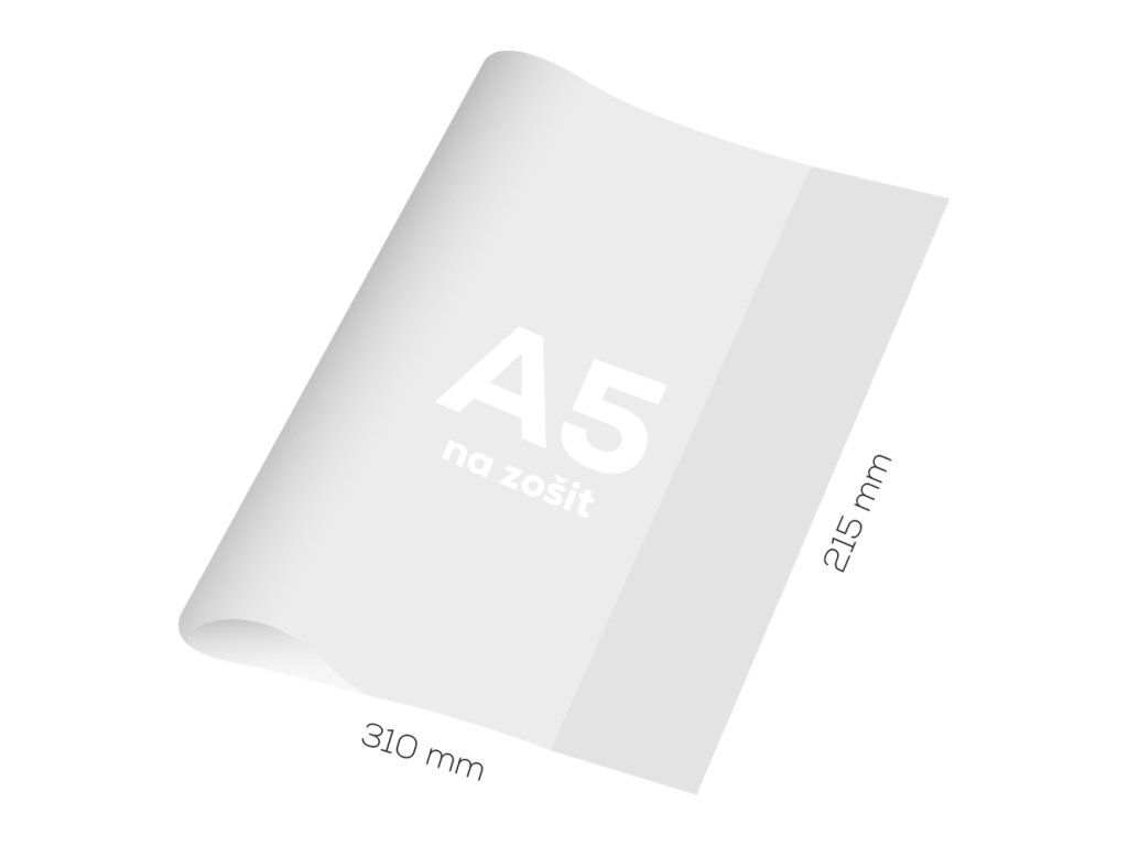 Transparentný obal na zošit A5, z pevného PVC, so zrnitou štruktúrou, so zaoblenými rohmi.Dodatočné parametre