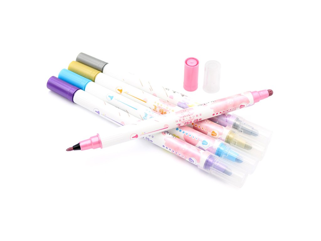 Obojstranný popisovač na vodnej báze. Sada obsahuje 5 ks, čiernu zlatú, modrú, fialovú a ružovú farbu. Kolekcia: Sakura.Dodatočné parametre