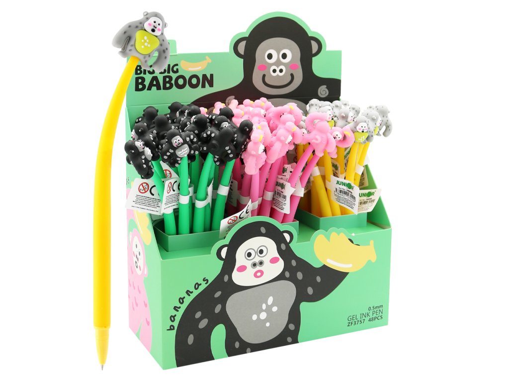 Dlhé gélové pero s gumenou figúrkou gorily na vrchnom, ohybnom konci (3 farby /3 dizajny).