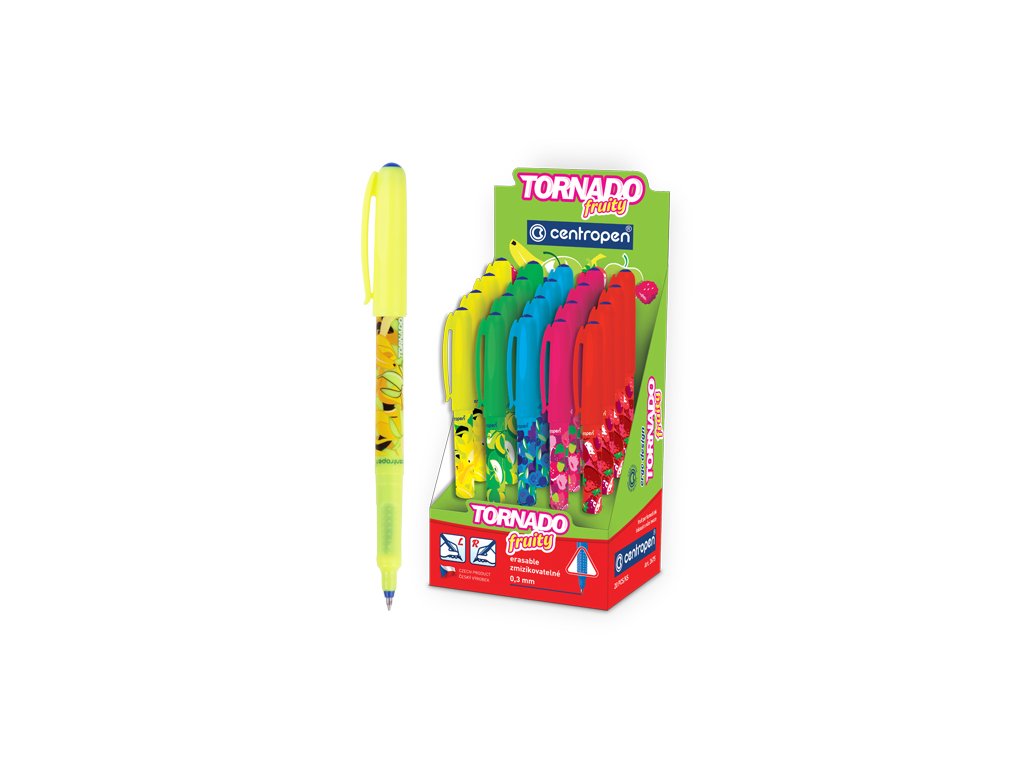 Obľúbené guľôčkové pero Tornado s trojuholníkovou úchopovou časťou s masážnymi bodmi, s tenkou rovnomernou stopou šírky 0.3 mm, ktorá sa dá vyzmizíkovať, atramentová náplň modrej farby - parfumovaný atrament (banán, jablko, jahoda, malina, čučoriedka). Telo pera je z kvalitného plastu, dodávané v 5 farebných kombináciách. Pero je určene pre pravákov, ľavákov i dysgrafikov.Dodatočné parametre