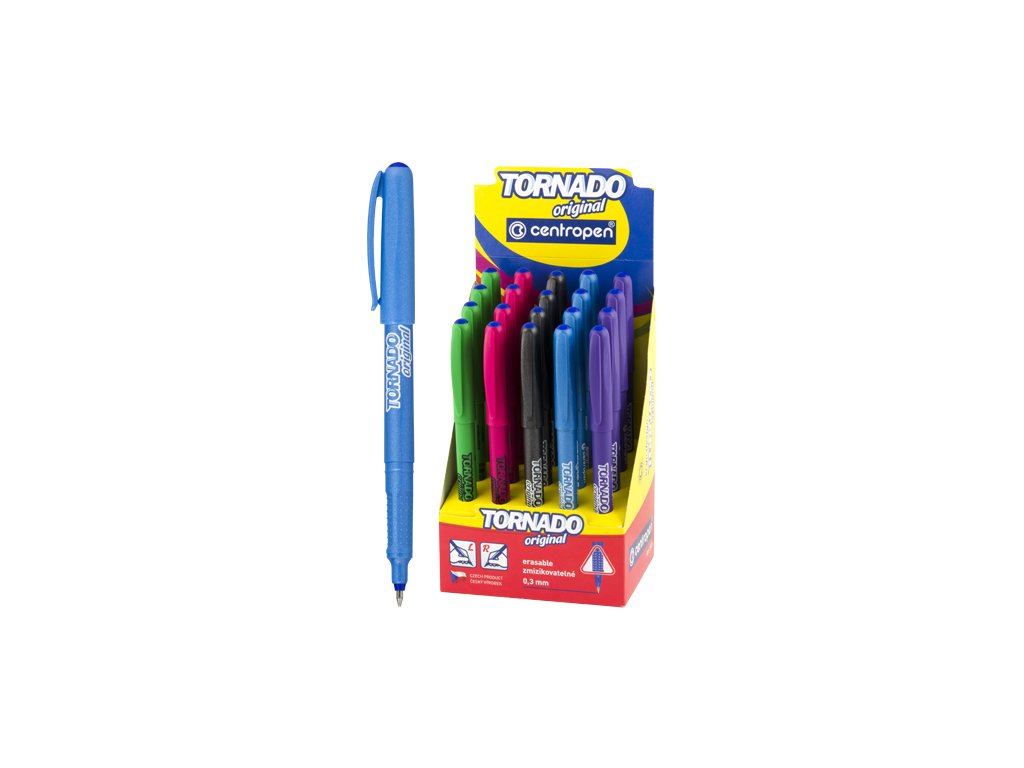 Obľúbené guľôčkové pero Tornado s trojuholníkovou úchopovou časťou, s masážnymi bodmi, s tenkou rovnomernou stopou šírky 0.3 mm, ktorá sa dá vyzmizíkovať, atramentová náplň modrej farby. Telo pera je z kvalitného plastu, dodávané v 5 farebných kombináciách. Pero je určené pre pravákov i ľavákov.Dodatočné parametre