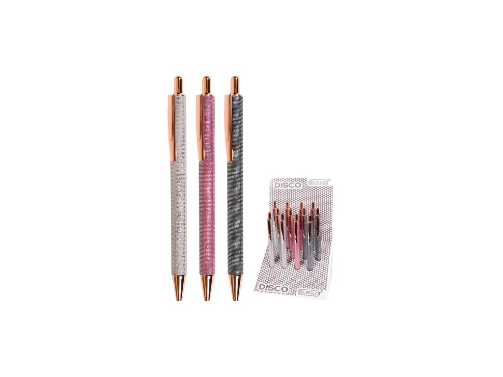 Guľôčkové pero s trblietavým telom a efektom disco gule v troch farbách: Strieborná /Ružová /Sivo-čierna.