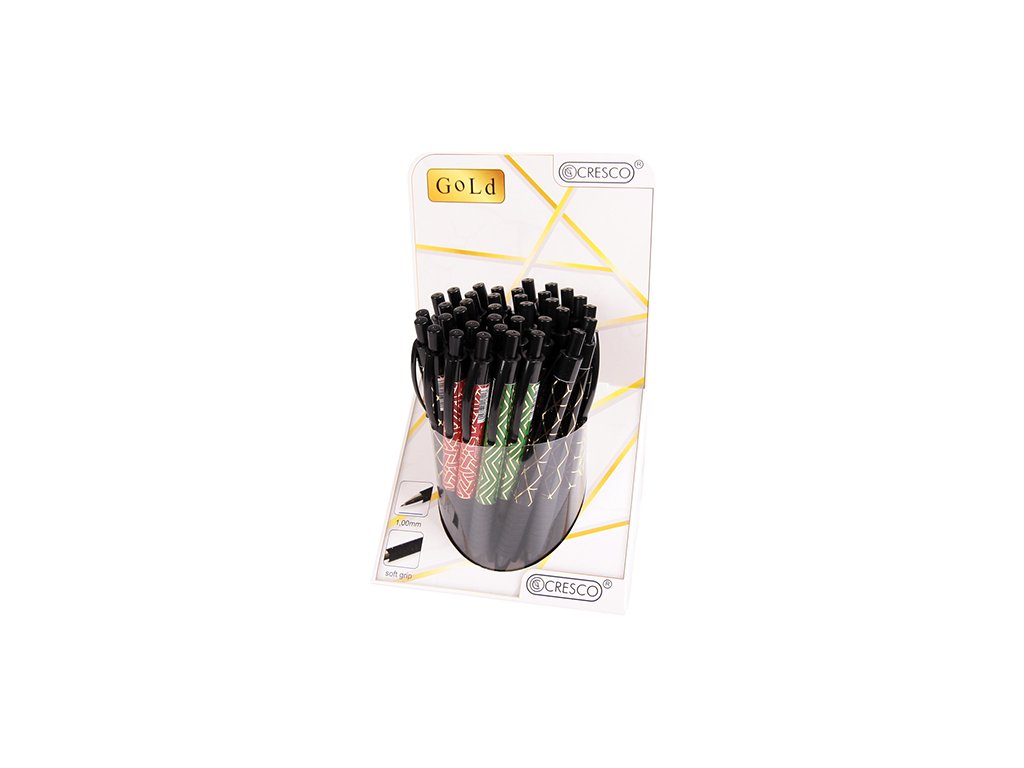 Guľôčkové pero s plastovým telom a potlačou v čiernej, zelenej a červenej farbe v kombinácii so zlatými prvkami.