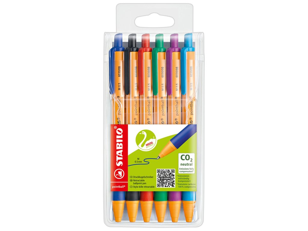 STABILO pointball v 6 farbách atramentu - modrej, čiernej, červenej, zelenej, fialovej a tyrkysovej.
