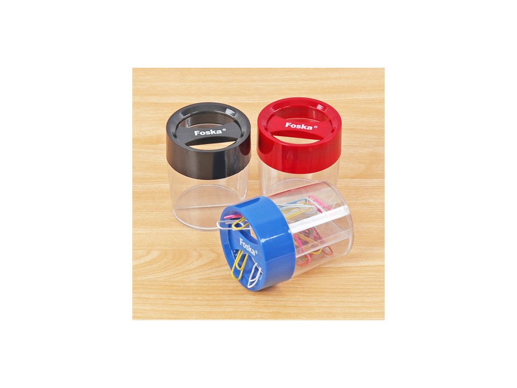 Plastový zásobník na spony vybavený magnetom vo vrchnáku pohára, pre jednoduché vyberanie kancelárskych sponiek. Dodávaný v štyroch farebných prevedeniach.Dodatočné parametre