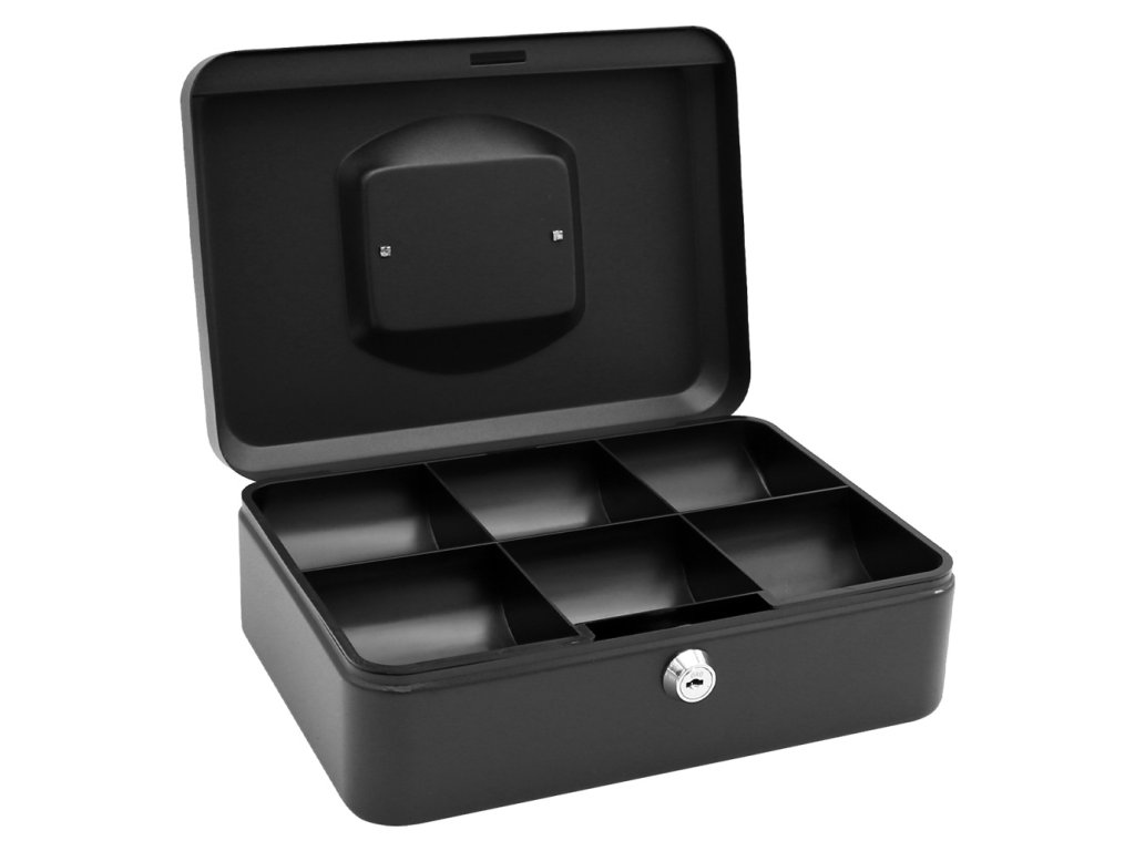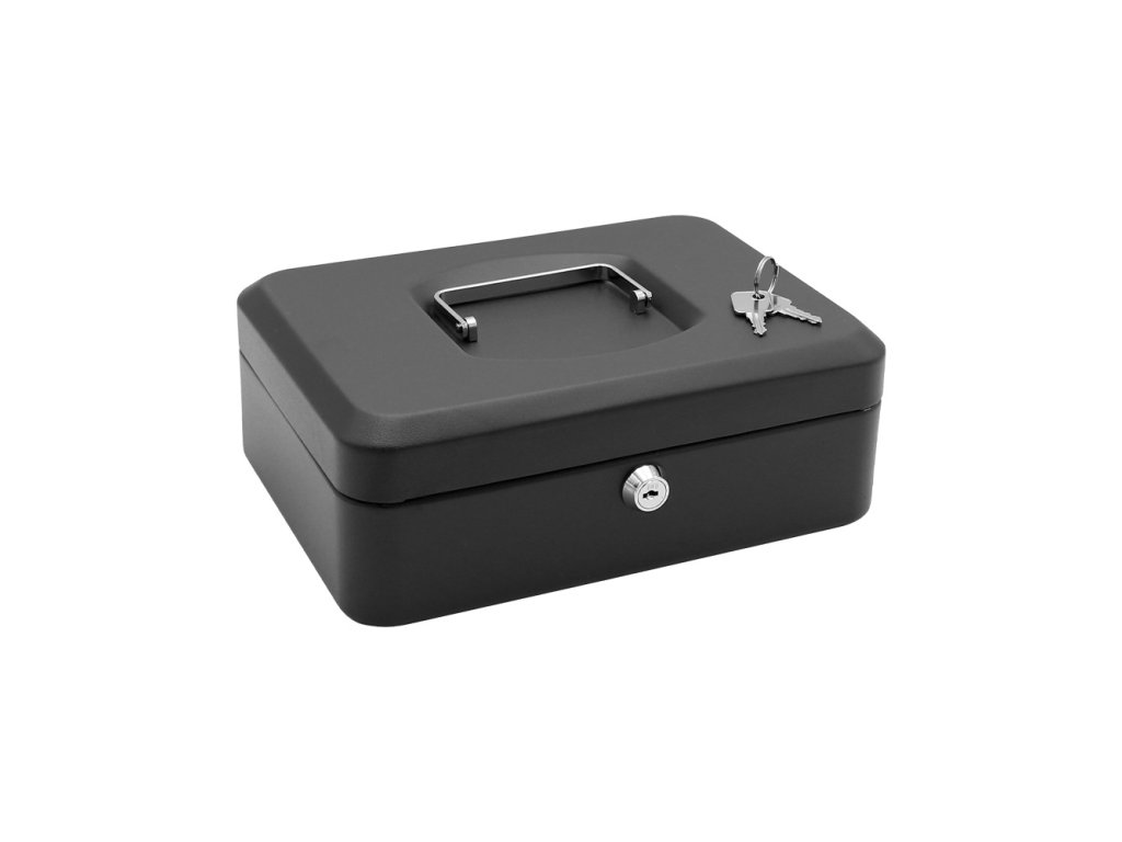 Uzamykateľná pokladňička vyrobená z kvalitnej ocele, s vyklápacím chrómovým madlom na ľahké prenášanie.
