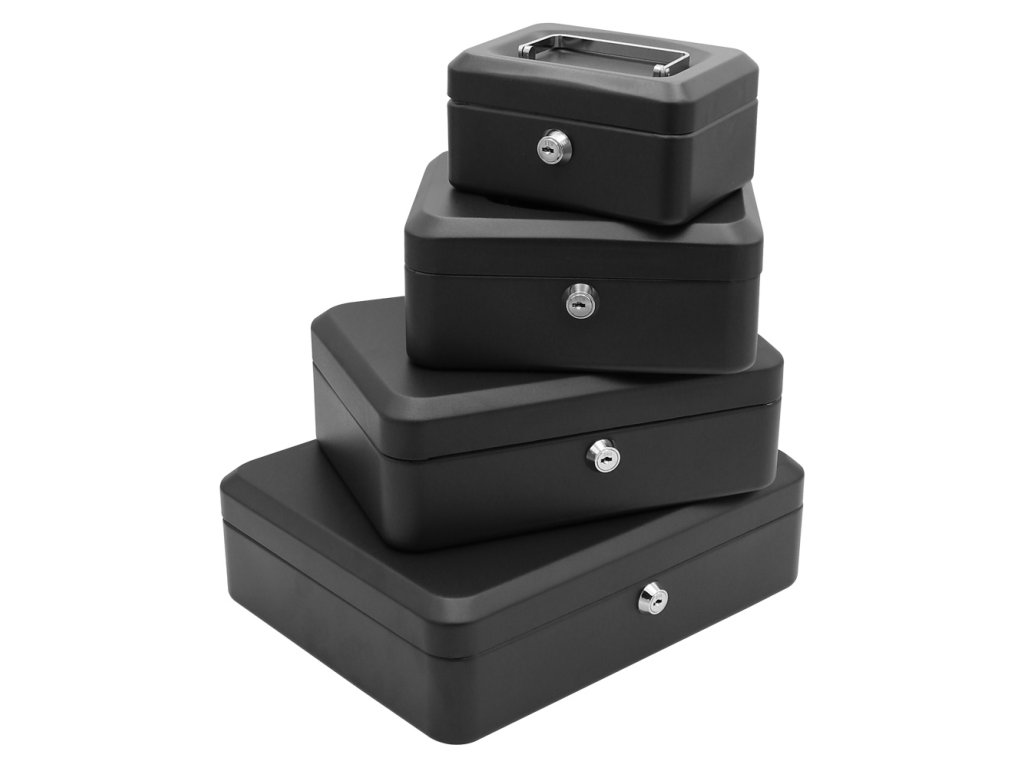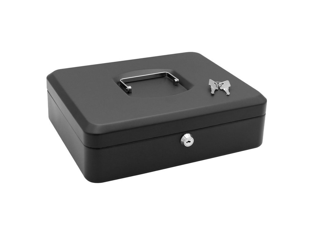 Uzamykateľná pokladňička vyrobená z kvalitnej ocele, s vyklápacím chrómovým madlom na ľahké prenášanie.
