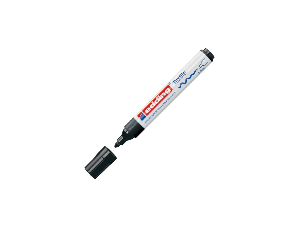 Popisovač na textílie s okrúhlym hrotom strednej hrúbky. Plnený atramentom bez zápachu na báze vody. Farby treba zafixovať žehlením na sucho. Po zafixovaní sú farby odolné voči praniu do 60°C. Šírka stopy: 2-3 mm. Farba: čierna.Dodatočné parametre