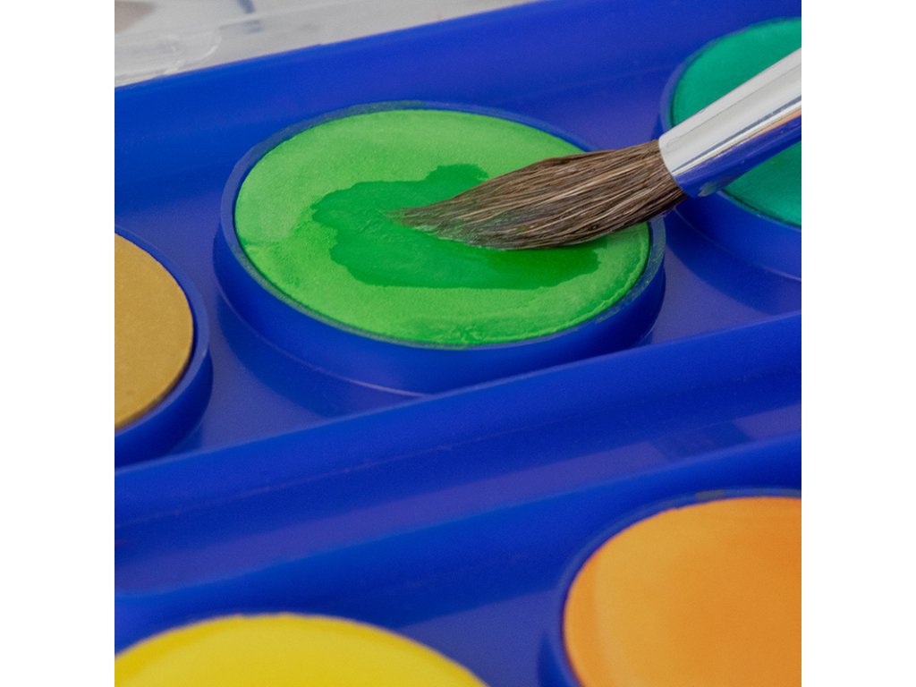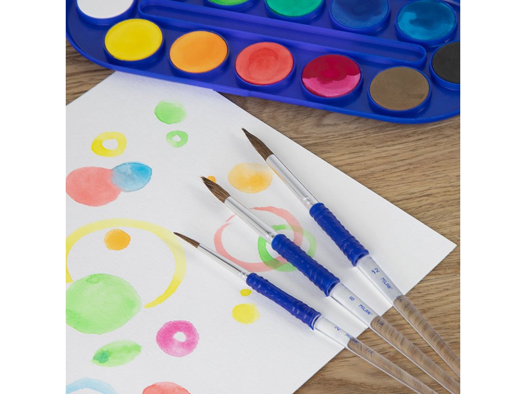 Guľatý štetec s krátkou plastovou rukoväťou s protišmykovou rukoväťou a hliníkovou objímkou. Zloženie: 70% prírodné kozie vlasy + 30% syntetické. Vhodné pre akvarel, vodné techniky a plagátovú farbu. Čísla 2, 8 a 12. Séria 116.Dodatočné parametre