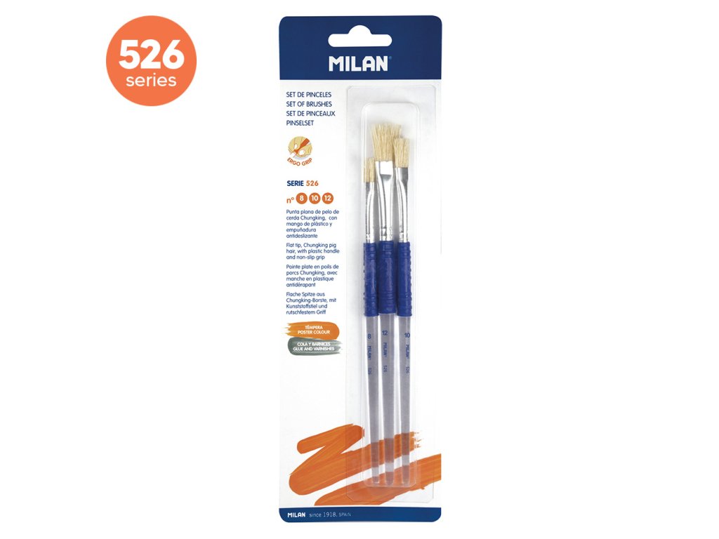 Plochý štetec s krátkou plastovou rukoväťou s protišmykovou ergonomickou rukoväťou a hliníkovou objímkou. Zloženie: Chungking prasacia srsť. Vhodné na plagátovú farbu, lepidlo a laky. Čísla 8, 10 a 12. Séria 526.Dodatočné parametre