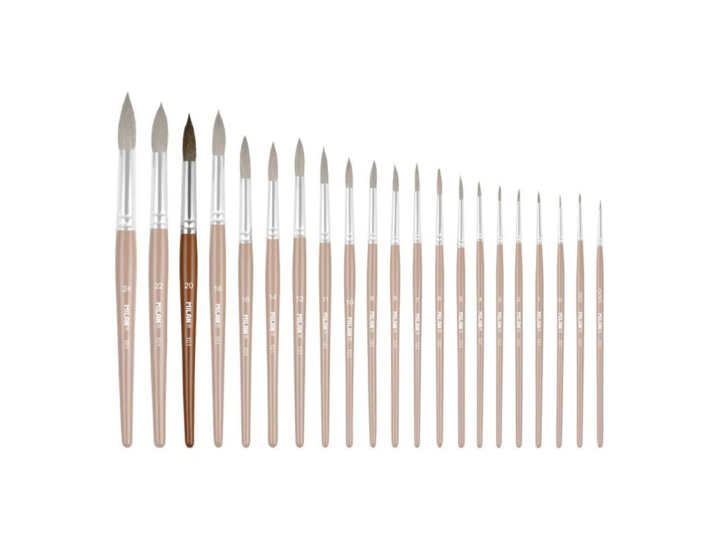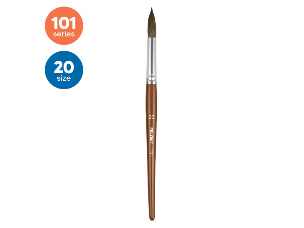 Guľatý štetec č. 20 z prírodného pony vlasu, s hnedou lakovanou rukoväťou z dreva so strieborným kovaním, je vďaka jemnosti vlákna vhodný najmä pre použitie v školách na maľbu akvarelovými a temperovými farbami. Zloženie: 70% prírodné kozie vlasy + 30% syntetické. Dĺžka štetín: 34,6 mm. Priemer štetín: 9,2 mm. Dĺžka štetca: 223 mm.Dodatočné parametre