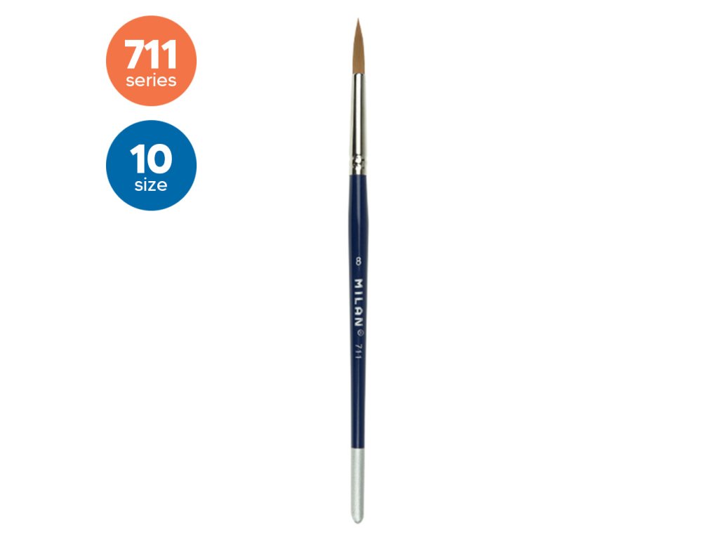Okrúhly štetec MILAN 711 číslo 10 Fine selection s krátkou drevenou rúčkou. Hnedá lakovaná povrchová úprava a nikel. Zloženie: syntetické štetiny (vlákna O 0,07 mm). Vhodné pre akvarelové a vodné techniky. Priemer štetín: 6,7 mm. Dĺžka štetín: 24,9 mm. Dĺžka štetca: 220 mm.Dodatočné parametre