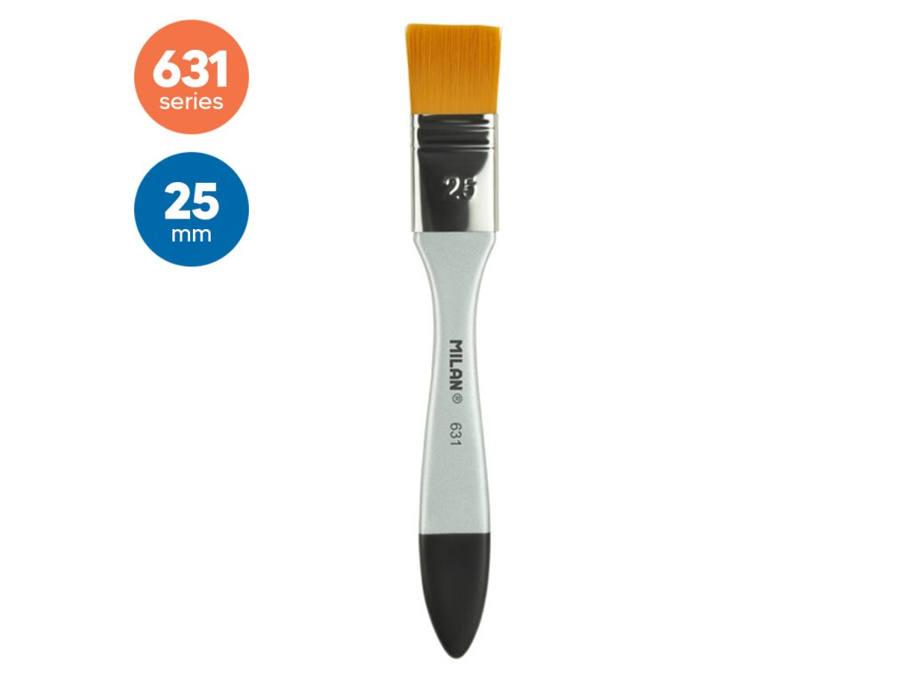Široký štetec MILAN 631 s krátkou drevenou rúčkou. Lakovaný povrch striebornej farby a hliníková dutinka. Zloženie: syntetické štetiny (vlákna O 0,10 mm). Vhodné na akvarelové, vodové techniky, olejové a akrylové maľby. Šírka štetín: 25 mm. Dĺžka štetín: 25,2 mm. Dĺžka kefy: 185 mm.Dodatočné parametre