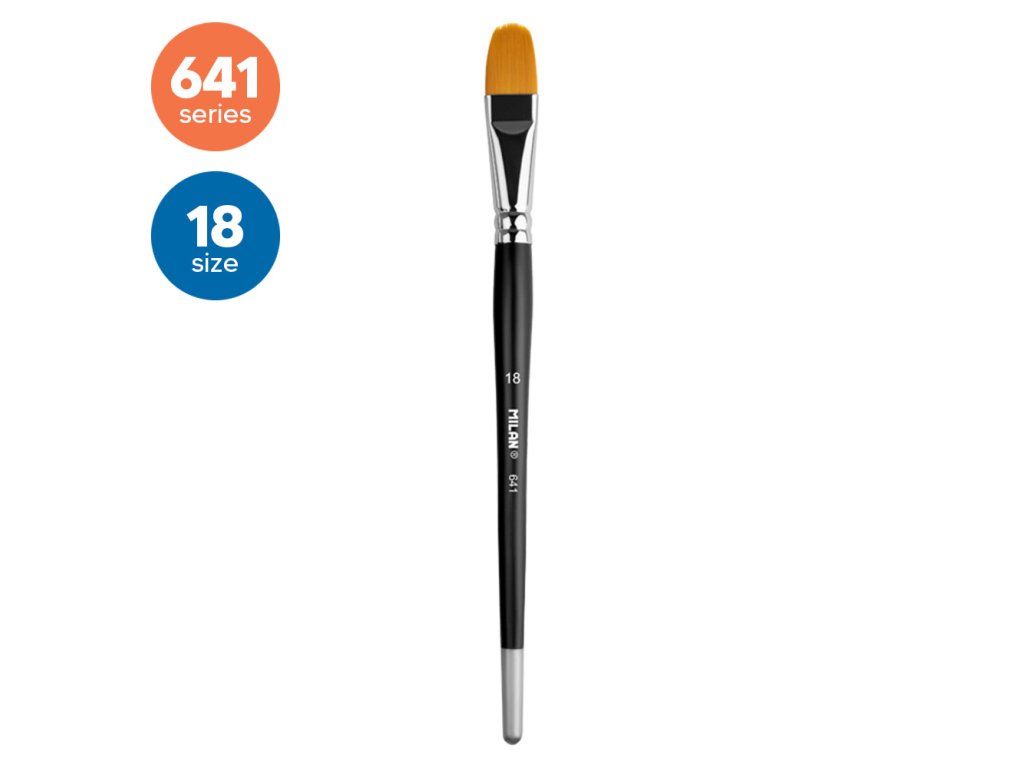 Plochý štetec č. 18 s drevenou rukoväťou. Čierna lakovaná povrchová úprava (matná) s niklovým úchopom. Zloženie: syntetické štetiny, priemer vlákna 0,70 mm a 0,10 mm. Vhodný na olejové a akrylové farby. Priemer štetín: 16,7 mm. Dĺžka štetín: 24,7 mm. Dĺžka štetca: 225 mm.Dodatočné parametre