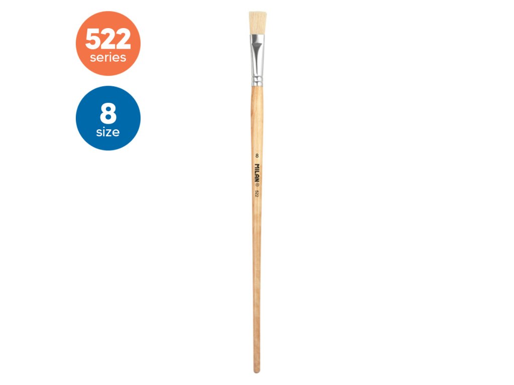Plochý štetec MILAN 522 s dlhou drevenou rukoväťou. Prírodne zalakovaná povrchová úprava a hliníková dutinka. Zloženie: prírodná štetina ošípaných Chungking. Vhodný na maľovanie olejom a akrylom. Priemer štetín: 13,5 mm. Dĺžka štetín: 23,8 mm. Dĺžka štetca: 320 mm.Dodatočné parametre