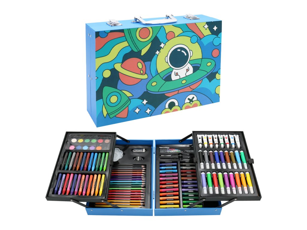 Sada na kreslenie pre chlapcov v kvalitne spracovanom kufríku s kovovým madlom a uzamykaním (motív vesmír).